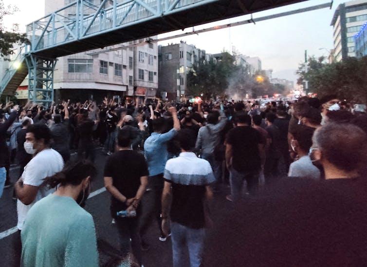 People gather in Tehran on Sept. 19, 2022, during a protest for 22-year-old Mahsa Amini, who died while in police custody.