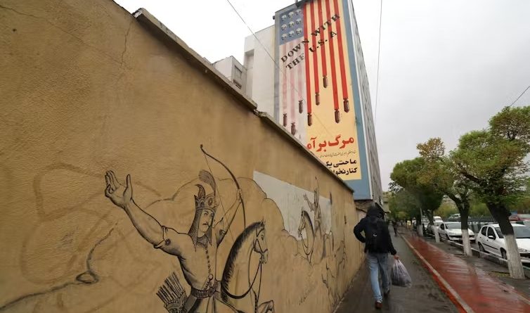 An Iranian walks past an anti-U.S. mural in Tehran on April 5, 2025.