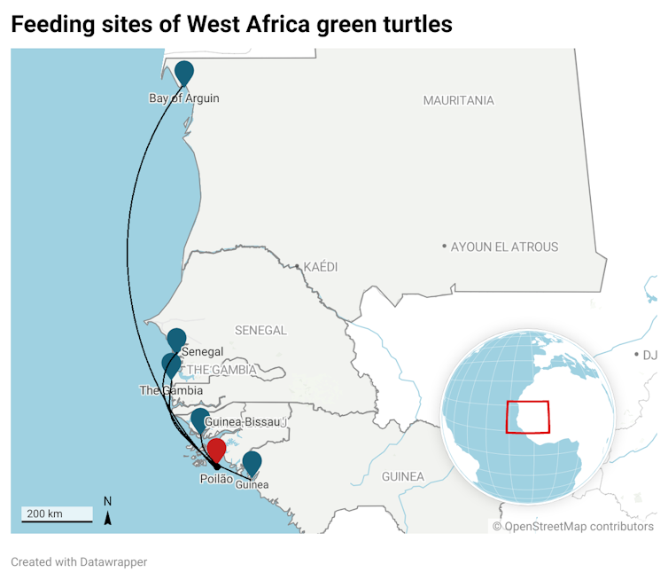 We found that the green turtles from Poilão connect at least five West African nations. Some turtles remained year-round in the waters of Guinea-Bissau or nearby in Guinea, to the south. Others travelled some 400 km north to feed in Senegal and The Gambia, or even as far as 1000 km northwards to the Bay of Arguin, in Mauritania.