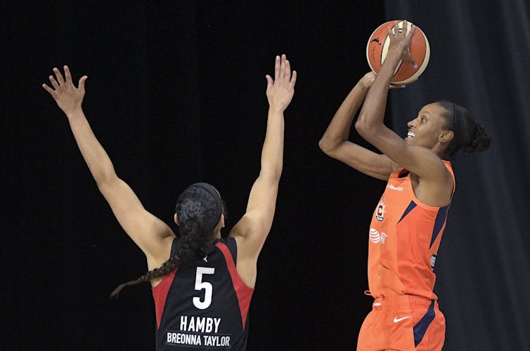 Players for the Connecticut Sun and the Las Vegas Aces square off during basketball’s WNBA semi-final in September 2020 in Bradenton, Fla.