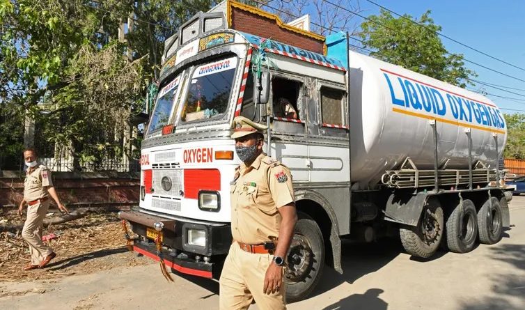 Police personnel escort a truck carrying medical liquid oxygen to the Guru Nanak Dev hospital in Amritsar, India, on April 24, 2021.