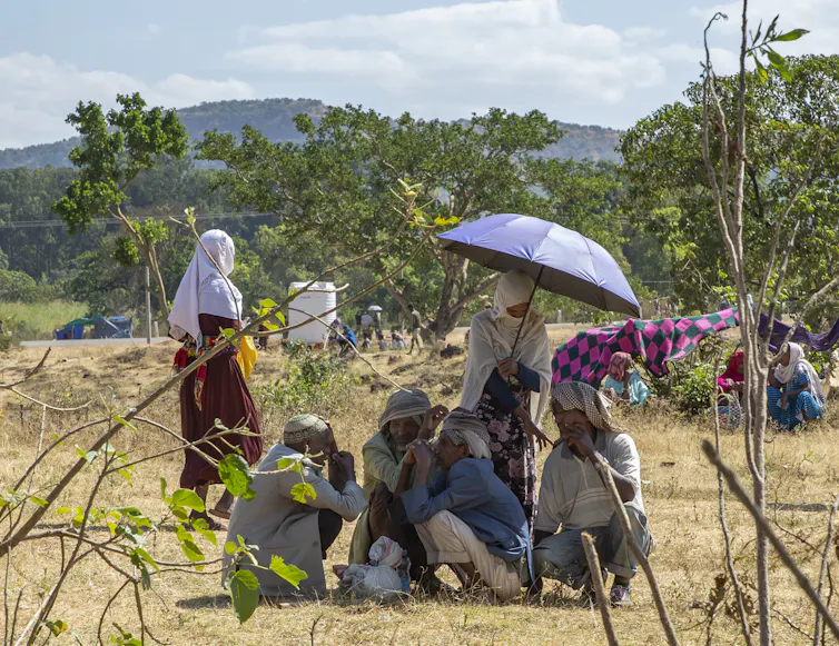 Survivors of the violence in Benishangul-Gumuz gather in a circle at a displaced persons camp in Chagni, Ethiopia in December 2020.
