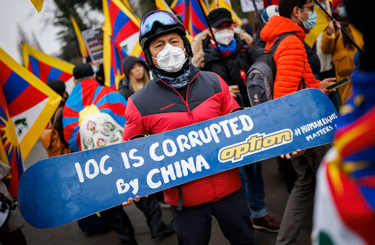 This protest outside IOC headquarters in early 2022 objected to the Winter Games being held in China.