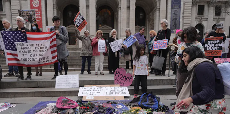 People protesting the U.S. and Israeli strikes on Iran gather in front of a New York Public Library location on March 8, 2026.