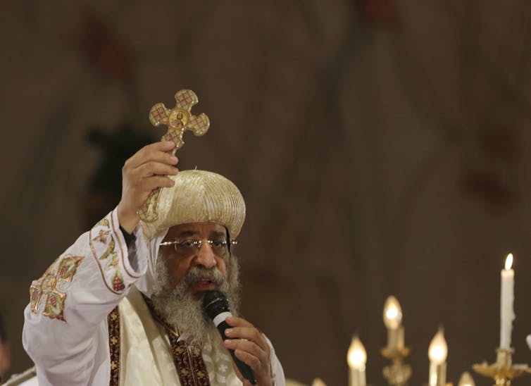 Pope Tawadros II, the 118th pope of the Coptic Church of Egypt, leads a mass for the Egyptian Christians who were killed in Libya, at St. Mark’s Cathedral in Cairo, Egypt, Feb. 17, 2015.