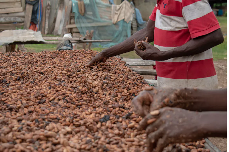 Cocoa farmers drying cocoa beans in Kunsu, Ghana.