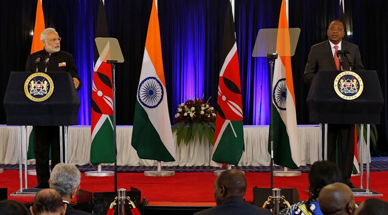 Indian Prime Minister Narendra Modi and Kenyan President Uhuru Kenyatta address a news conference at State House in Nairobi.