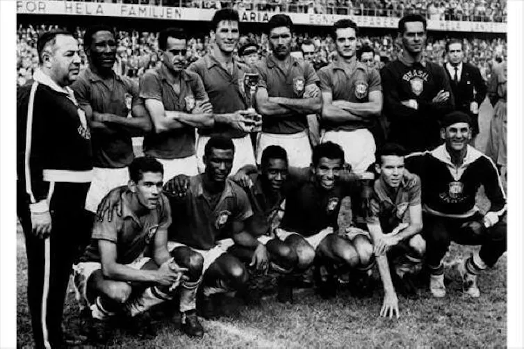 Brazil, the 1958 World Cup winners: Vicente Feola (coach), Djalma Santos, Zito, Bellini, Nilton Santos, Orlando, Gylmar, Garrincha, Didi, Pelé, Vava, Zagallo.