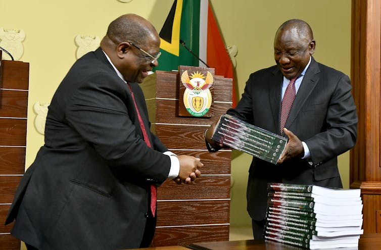 President Ramaphosa, right, receives the final report of the State Capture Commission from Judge Zondo in 2020.
